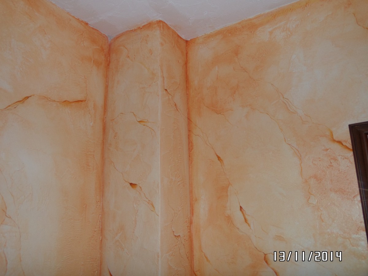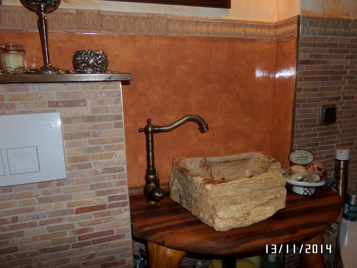 Badgestaltung im Bereich der Naßstrecke über dem Waschbecken Wandputz mit mehrlagigem Marmorspachtel und Überzug aus Bootslack glänzend